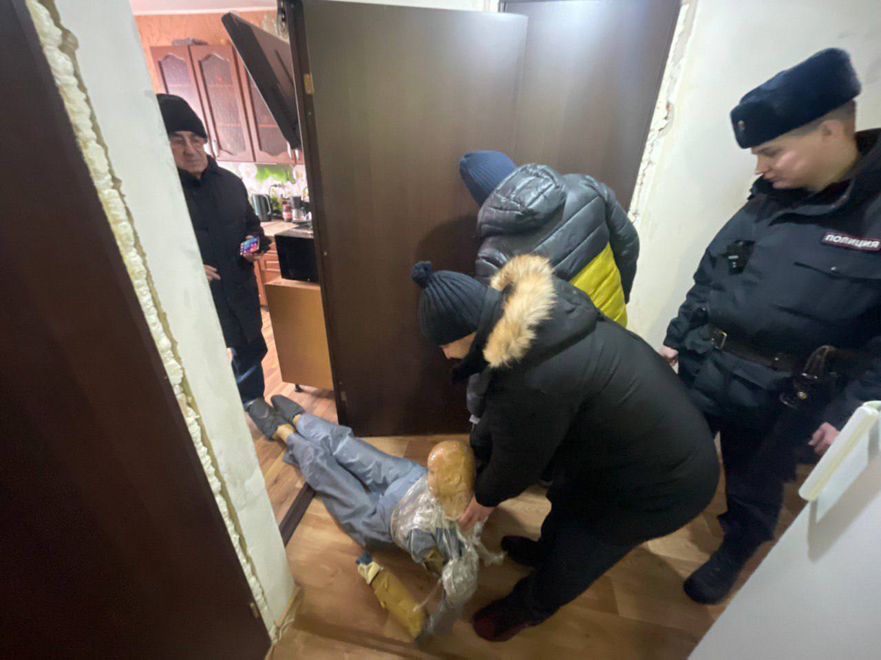 В дальнейшем, чтобы скрыть следы преступления злоумышленник попытался избавиться от тела. Обмотав тело потерпевшего полиэтиленовыми пакетами и скотчем, он вынес его на лестничную площадку, где был задержан сотрудниками полиции.