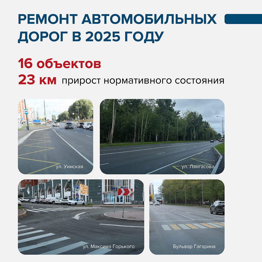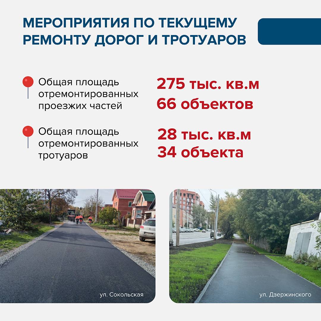 Всего в 2025 году отремонтировано 66 дорог и 34 тротуара. Ещё 20 объектов улично-дорожной сети и 15 тротуаров отремонтируем в этом году.