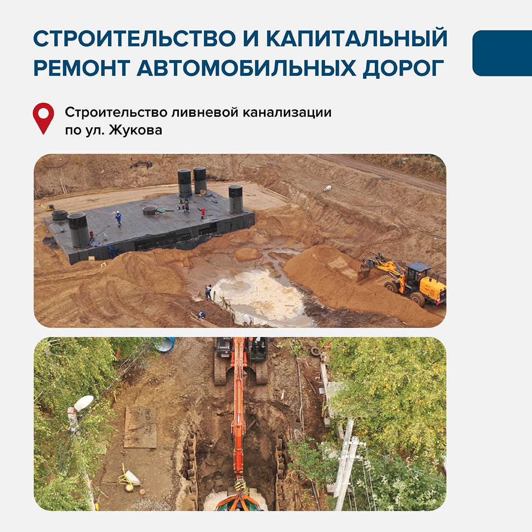 Продолжаем развитие инфраструктуры в новых районах. В Камской долине ведется строительство ливневой канализации с очистными сооружениями протяженностью 1,4 км. Завершить работы планируем в июне.
