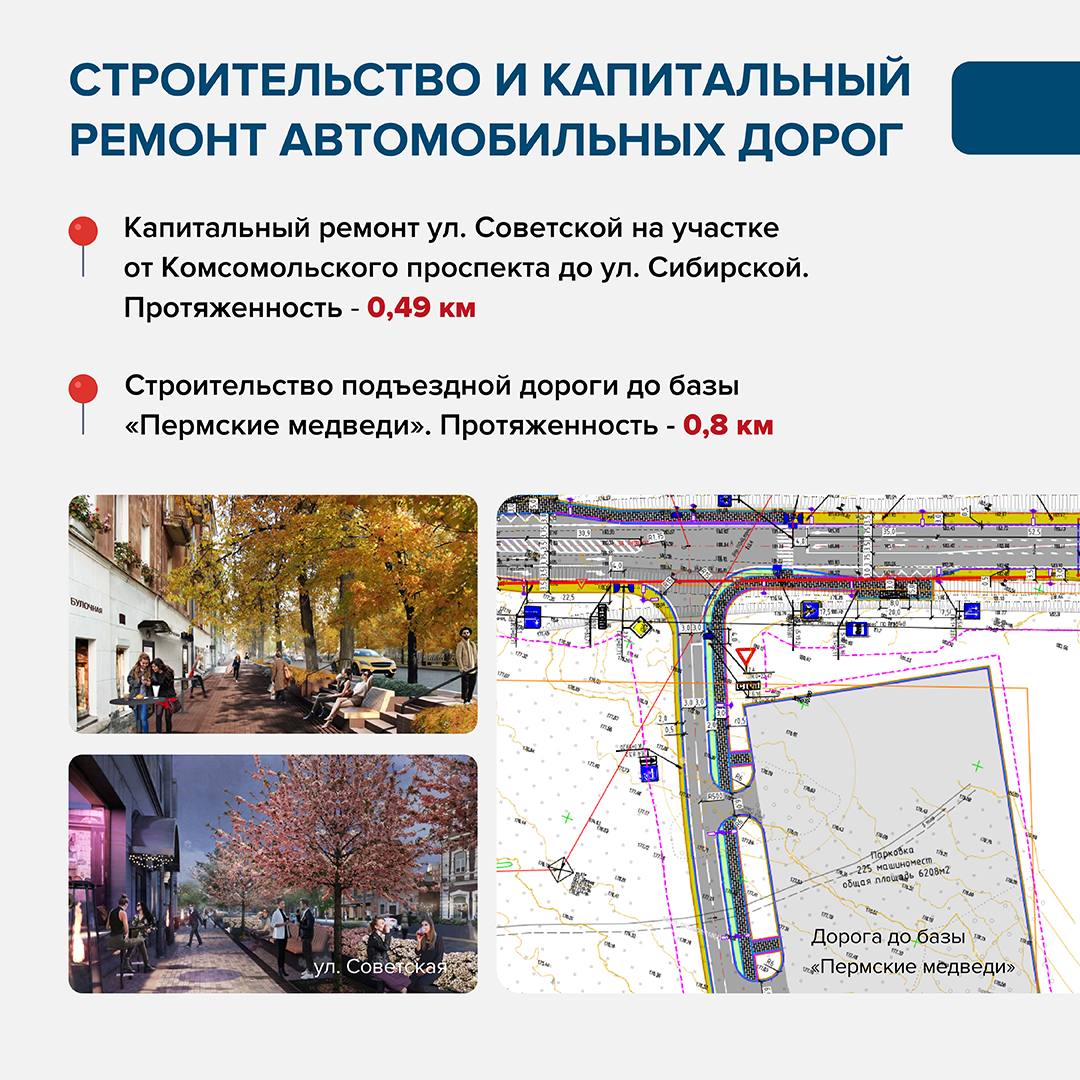 В работе находятся и крупные объекты с горизонтом реализации до 2027 года: капитальный ремонт улиц Борчанинова, Строителей и Советской, строительство подъездной дороги к базе «Пермские медведи», а также продолжение Ивинского проспекта. Эти проекты направлены на повышение транспортной доступности и снижение нагрузки на улично-дорожную сеть.