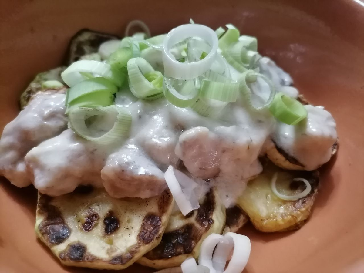 Предлагается приготовить необычное сочетание: обжаренные кабачки и мясо с грибами в сметанном соусе. Блюдо состоит из двух основных компонентов:
