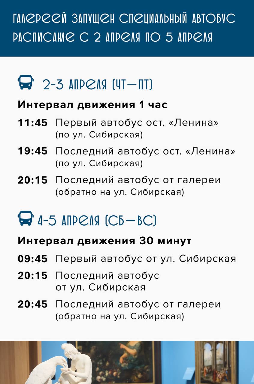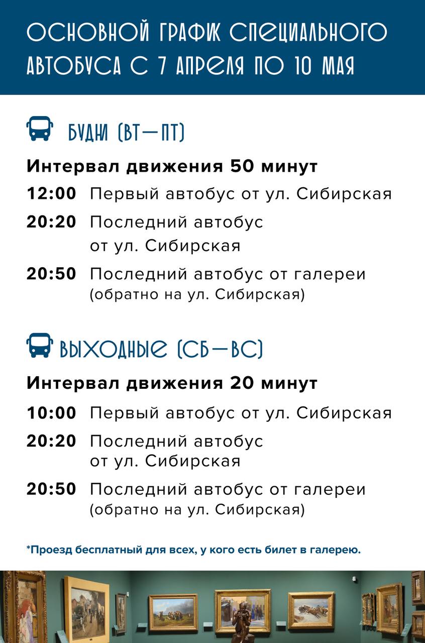 Для первых посетителей галерея приготовила специальный формат Дней открытия, которые пройдут со 2 по 5 апреля. Информация о билетах — по ссылке. Добраться до нового здания можно пешком от остановок «Улица Максима Горького» и «Разгуляй», а также на специальном автобусе галереи. Он курсирует от остановки «Улица Ленина» на улице Сибирской прямо к входу. Подробнее о расписании автобуса читайте в карточках.