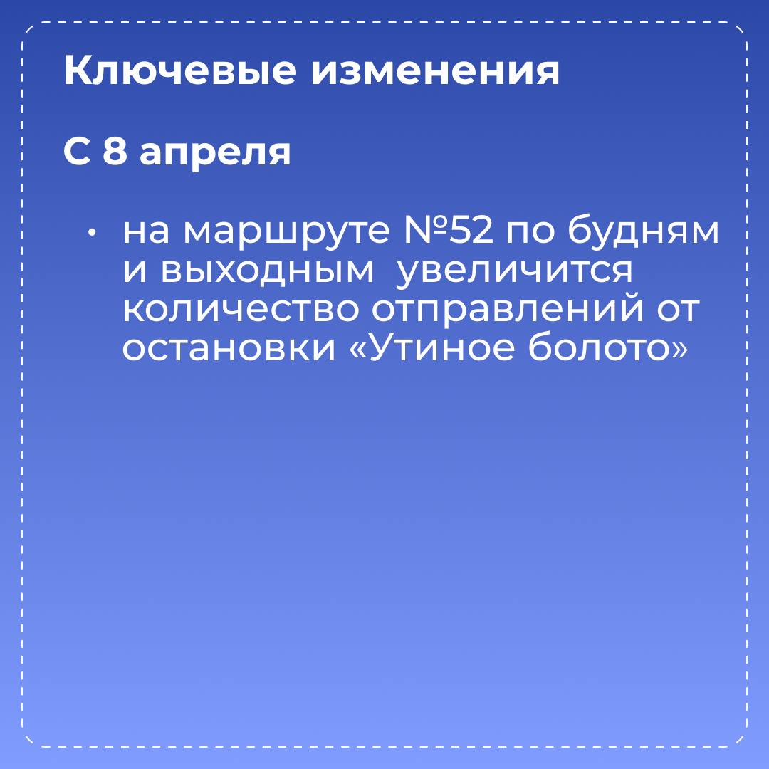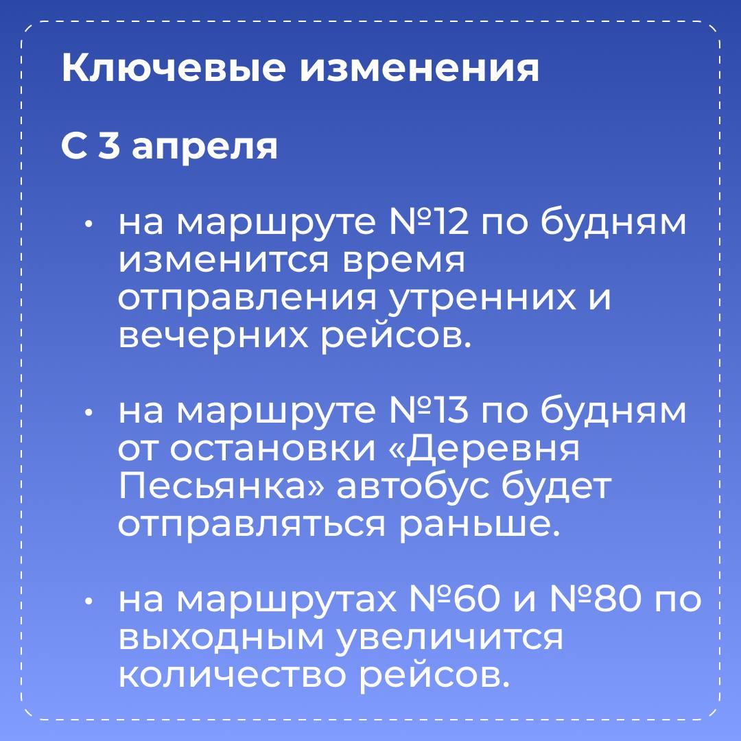 Изменения затронут расписание автобусов №12, №13, №52, №60 и №80. При составлении корректировок были приняты во внимание пожелания горожан и статистика пассажиропотока. Эти изменения помогут повысить провозную способность маршрутов, что напрямую влияет на комфорт поездки.