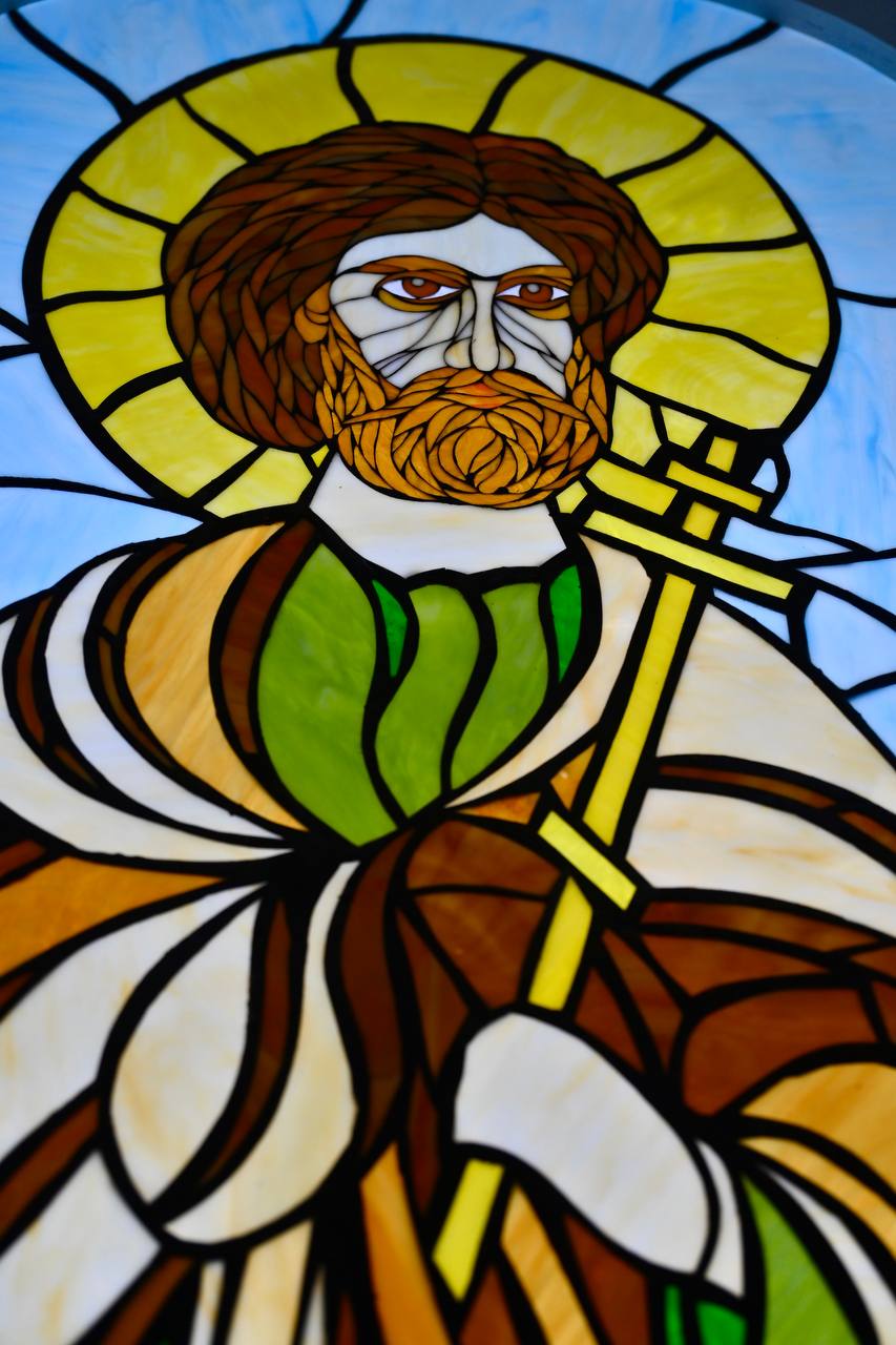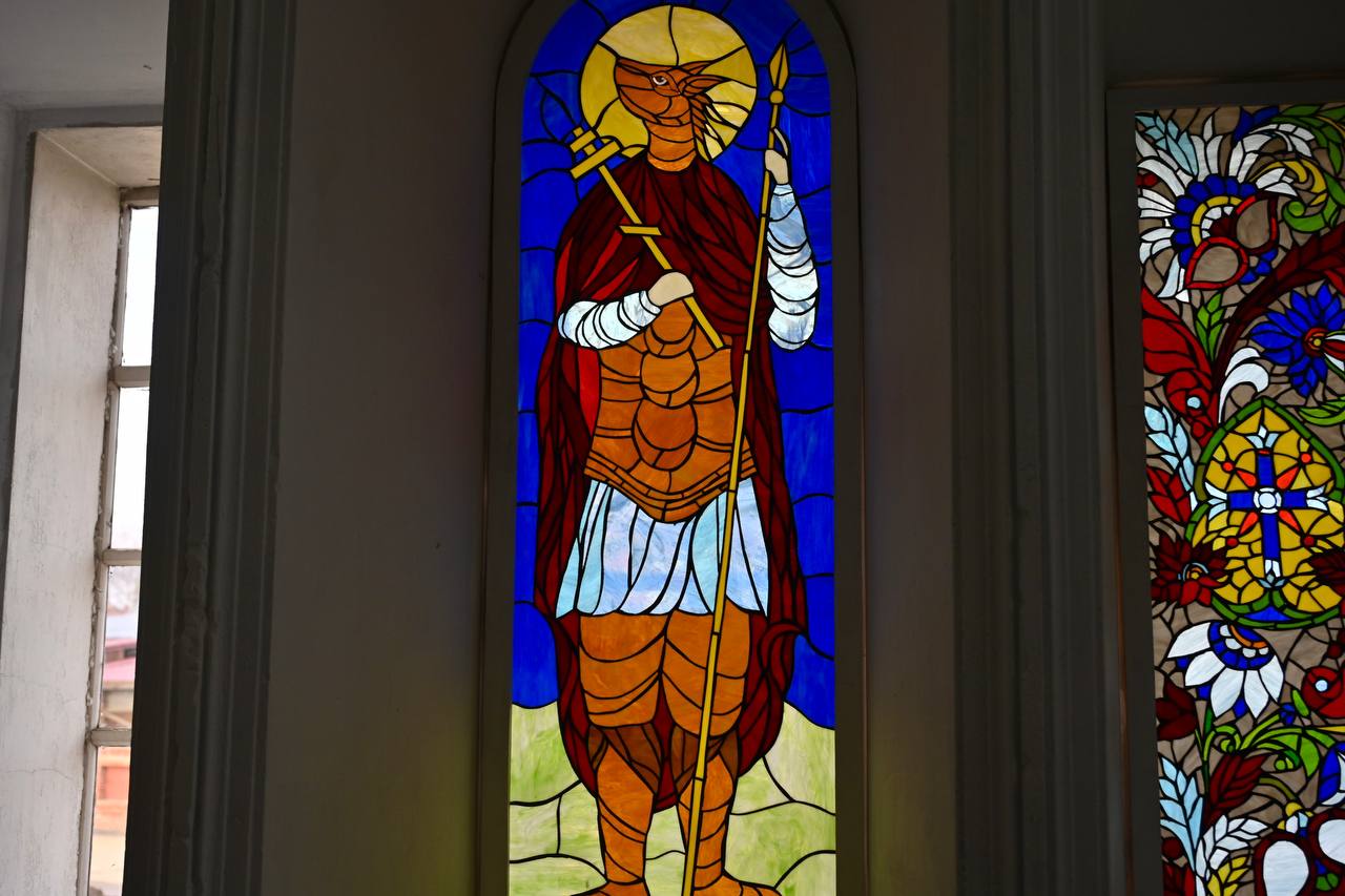 А сейчас здесь реализуют уникальный проект — «Пермские вехи. Кудымкар и Чердынь. Песнь мифов». Воссоздают в стекле религиозные сюжеты по мотивам фресок храма и икон, в том числе с изображением Святого Христофора-Псоглавца, которая хранится в музее.