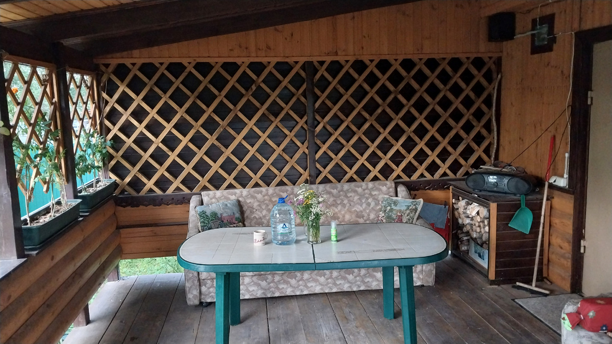 Эти выходные стали знаковыми для дачного хозяйства: приезжающий с долгожданным новым диваном, который был заказан много месяцев назад, предвкушает уют и комфорт. После 17 лет службы на даче и 16 лет в старой квартире, старый диван, казалось, уже выдохся. Первоначально планировалось разобрать его на растопку для бани, но, увидев, как он органично вписывается в новую веранду, было решено оставить.
