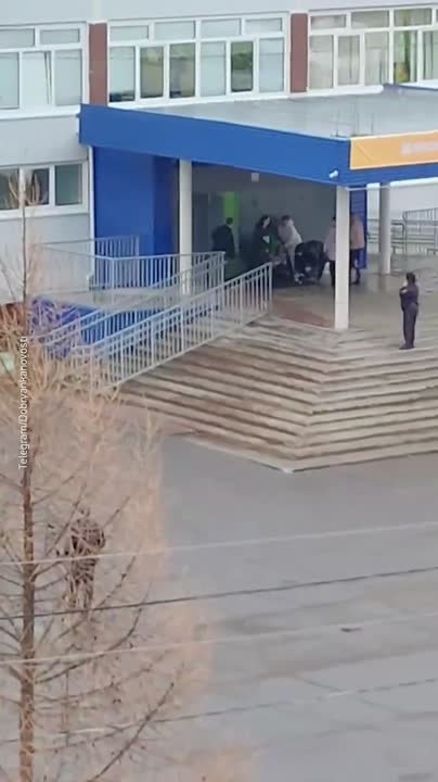 Первые минуты после нападения школьника на учительницу в Добрянке в Пермском крае. Скорая помощь подъезжает к учреждению, чтобы забрать раненую. Ее госпитализировали в крайне тяжелом состоянии, но спасти не удалось.