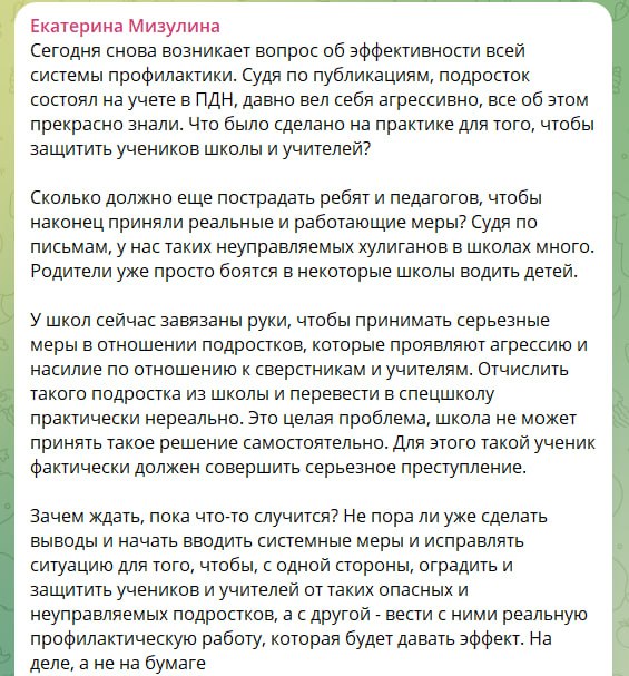 Глава Лиги безопасного интернета Екатерина Мизулина прокомментировала убийство учителя школьником в Добрянке.