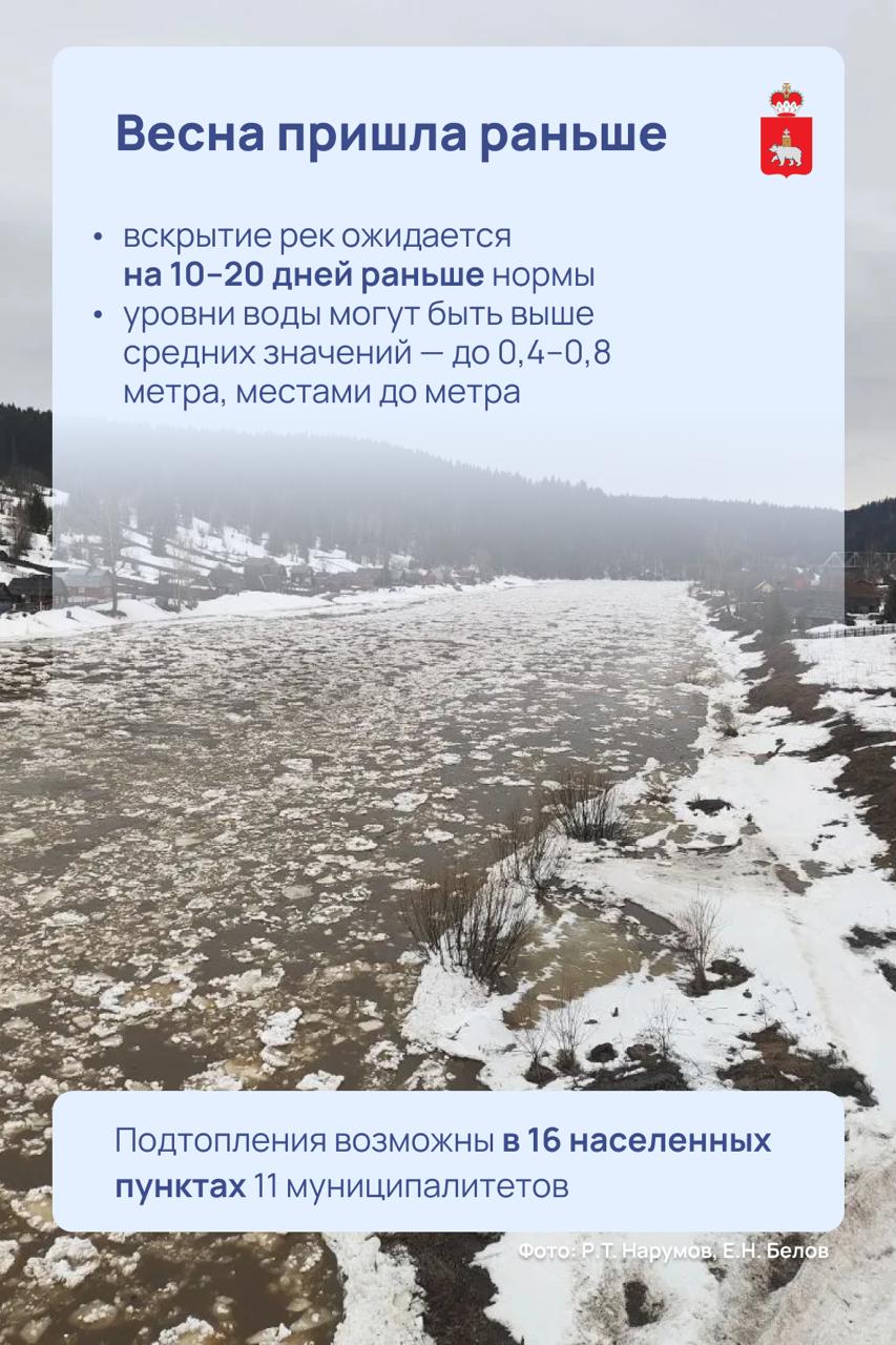 Весна в Прикамье пришла раньше обычного — реки начали прибывать, а у нас их почти 30 тысяч. Уже фиксируем небольшие подтопления, но они не представляют серьезной угрозы. Эксперты гидрометеослужбы пока не прогнозируют сильного половодья, но бдительность не теряем. У нас многие населенные пункты стоят прямо у воды, поэтому все службы должны быть готовы к любой ситуации.