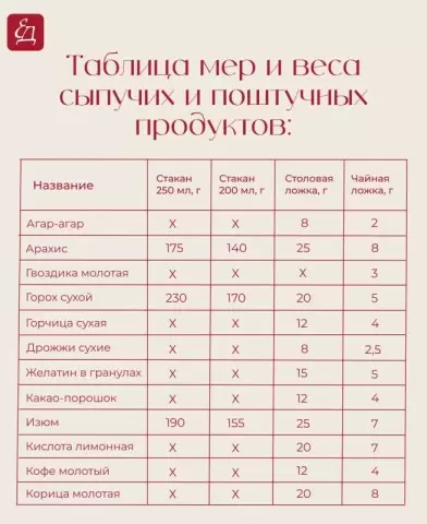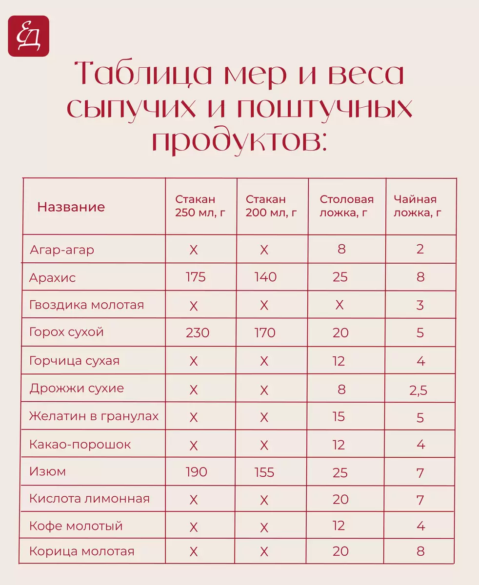 Не забудьте сохранить этот материал, чтобы в любую минуту иметь под рукой полезные таблицы для измерения. Удивите своих близких вкусными блюдами и получайте удовольствие от процесса приготовления!