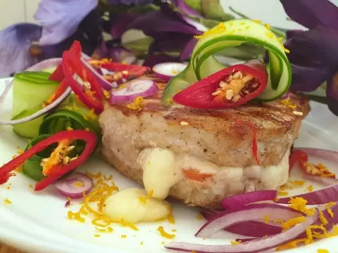 Этот стейк из свинины с тянущимся сыром и ароматной начинкой — идеальный выбор для настоящих гурманов, которые ценят сочные и насыщенные вкусы.