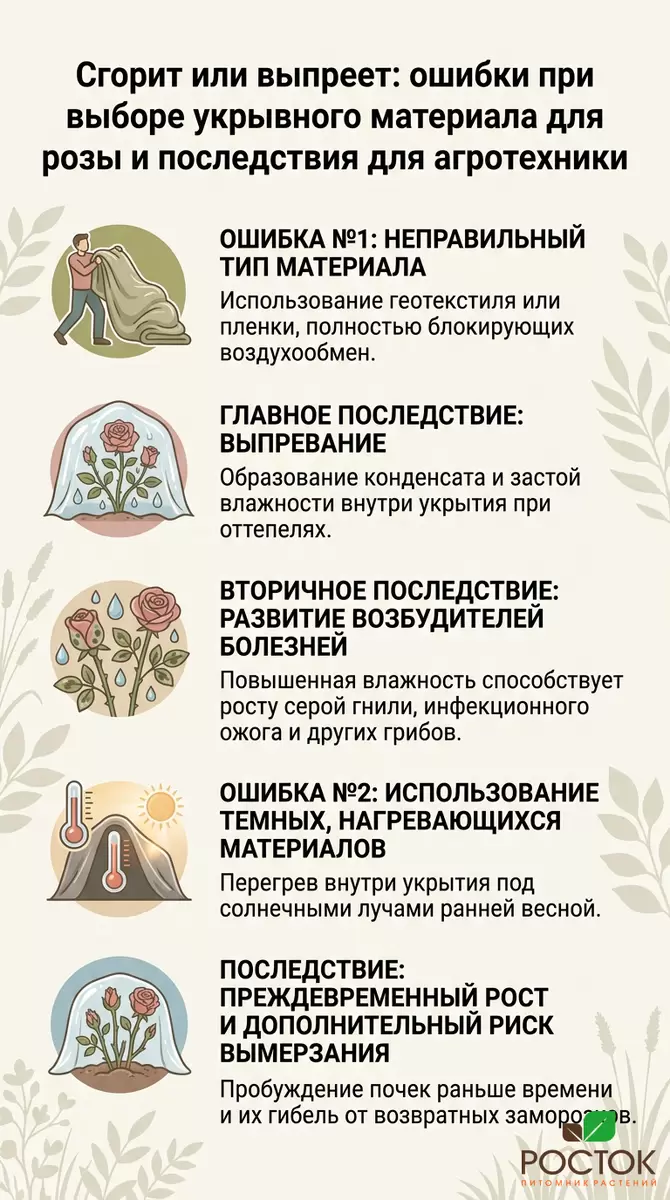 Ошибка многих новичков — это использование полиэтиленовой пленки для укрытия. Непромокаемость пленки приводит к тому, что под ней скапливается влага, что создает идеальные условия для грибка. На весеннем солнце под такой «крышкой» температура быстро поднимается, что приводит к гниению.