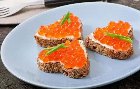 Эти элегантные канапе порадуют ваших гостей. Подсушите ломтики хлеба, намажьте их сливочным сыром, добавьте немного красной икры и украсьте зеленью.