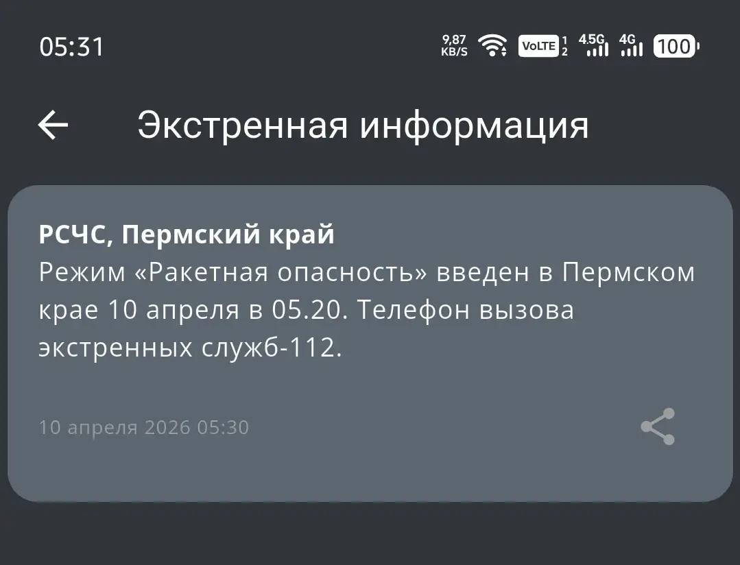 РСЧС: режим «Ракетная опасность» введен в Пермском крае