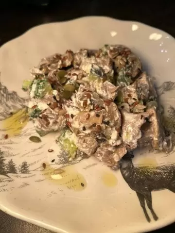 В результате получается теплый ароматный салат без излишеств и с насыщенным вкусом. Это блюдо станет отличным вариантом для полноценного ужина.