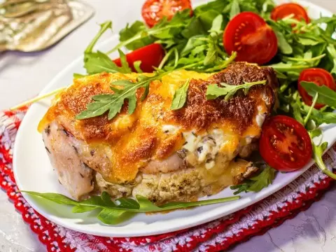 Сверху всё засыпается щедрой сырной корочкой из моцареллы, создавая аппетитную верхнюю пленку. Запекается до золотистой корочки при умеренной температуре, чтобы и капуста, и курица остались сочными.