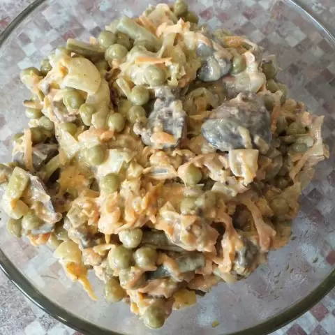Шаг 7: Заправить салат на свой вкус, используя майонез (в качестве альтернативы можно взять сметану). Перемешать все ингредиенты и дать настояться в холодильнике около 30-40 минут.