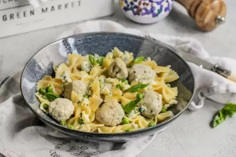 Последний этап – аккуратно вмешать отваренную пасту в фрикадельки и горошек на сковороде, прогреть 2-3 минуты. Подавайте горячим, посыпав оставшимся сыром с голубой плесенью.