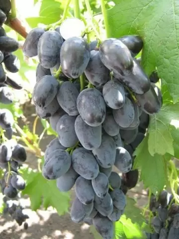 Этот сорт заслуживает особого внимания благодаря своим впечатляющим ягодам, имеющим тёмно-синюю окраску и отличный размер — от 9 до 12 граммов. Гроздья формируются крупные, конической формы, средней плотности, что минимизирует риск повреждений и гнили.