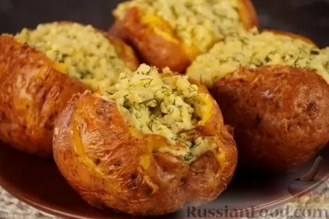 - Крошка-картошка с брынзой: запеченная картошка, наполненная сырной начинкой с зеленью и чесноком, прекрасно сочетается с любыми напитками.