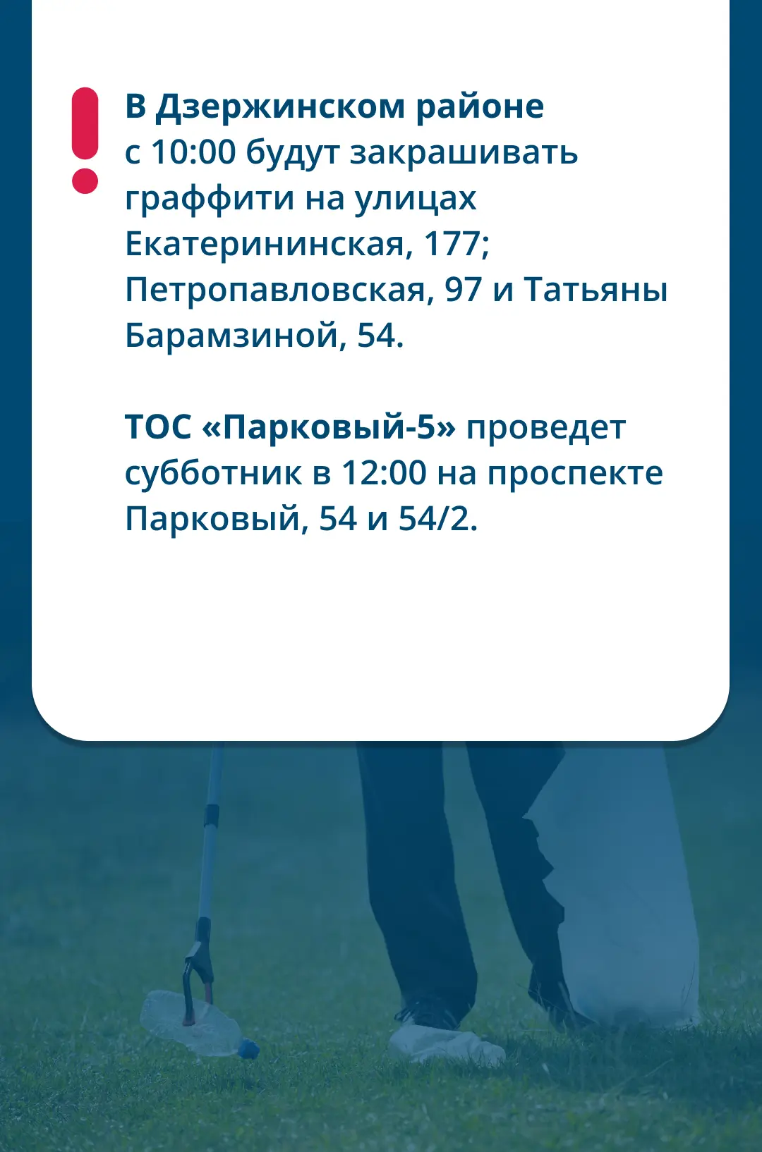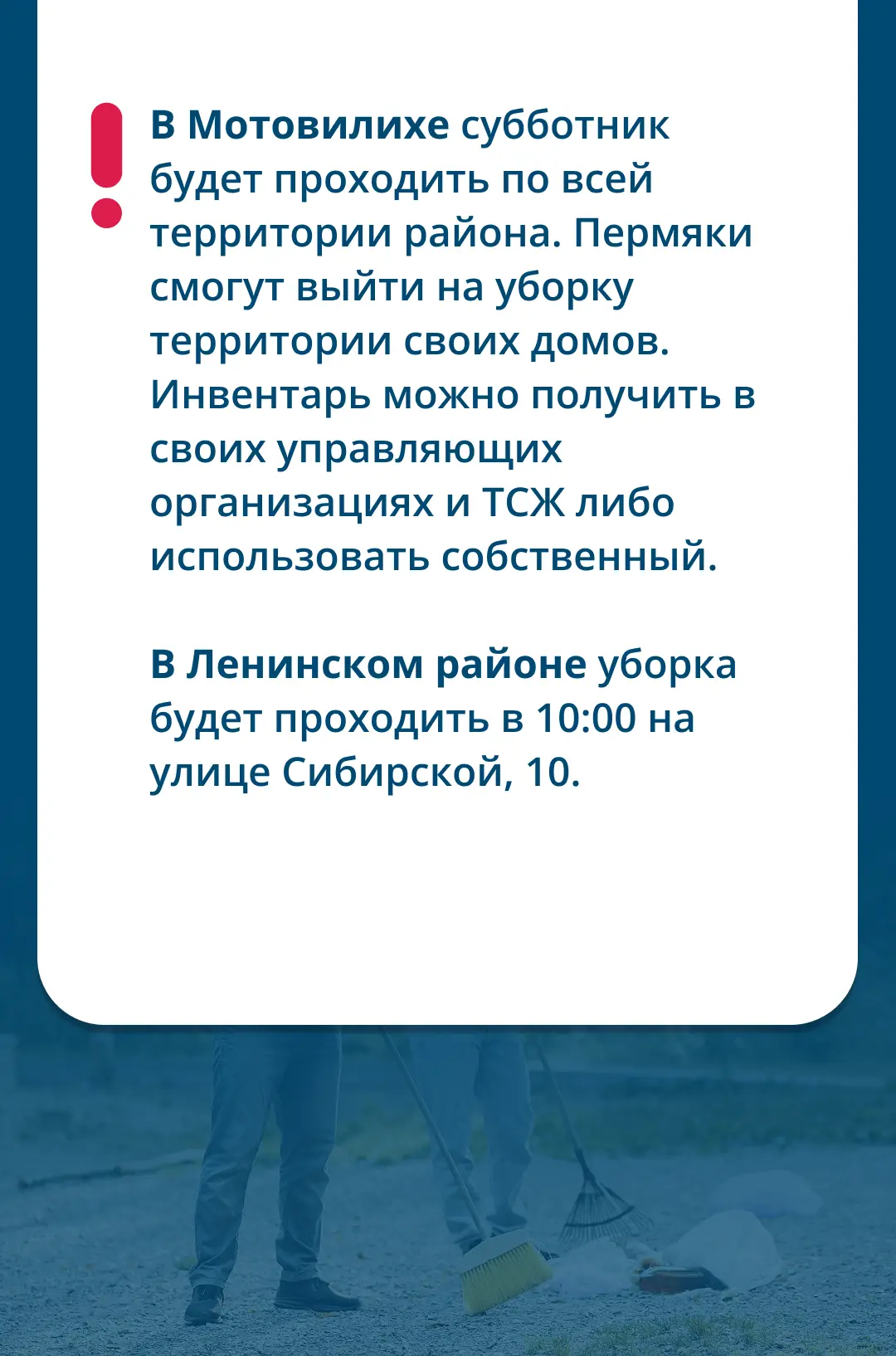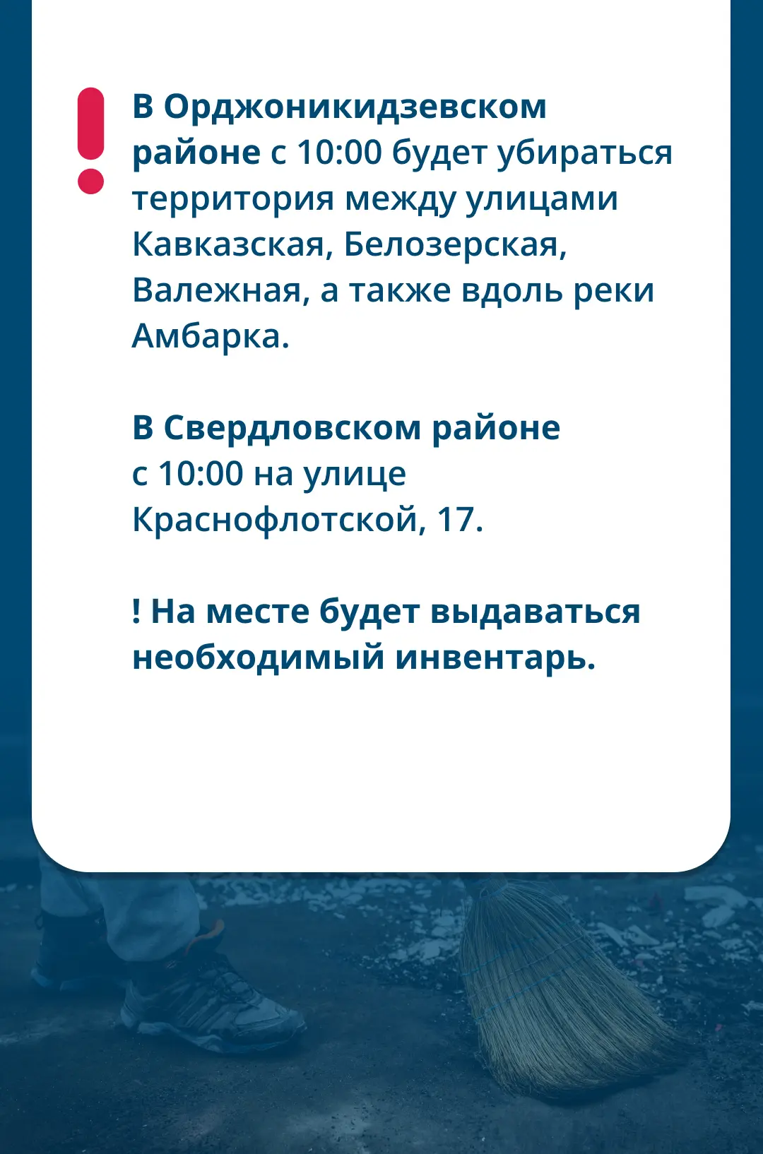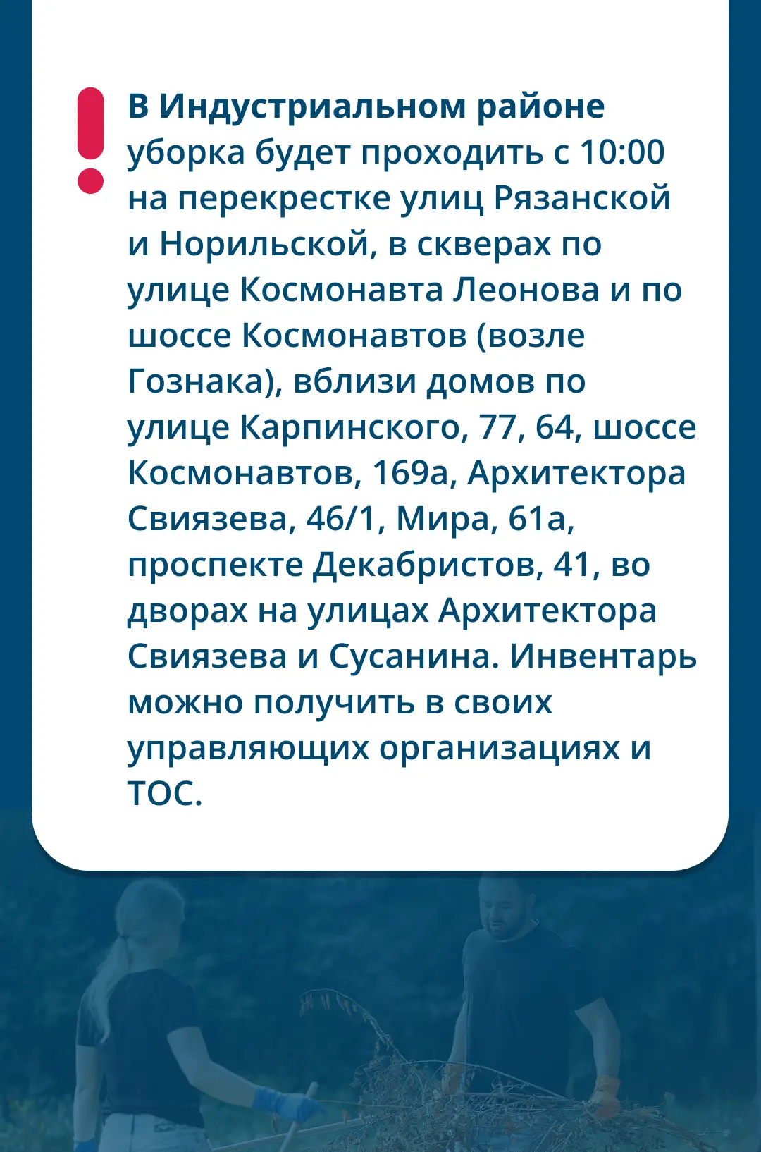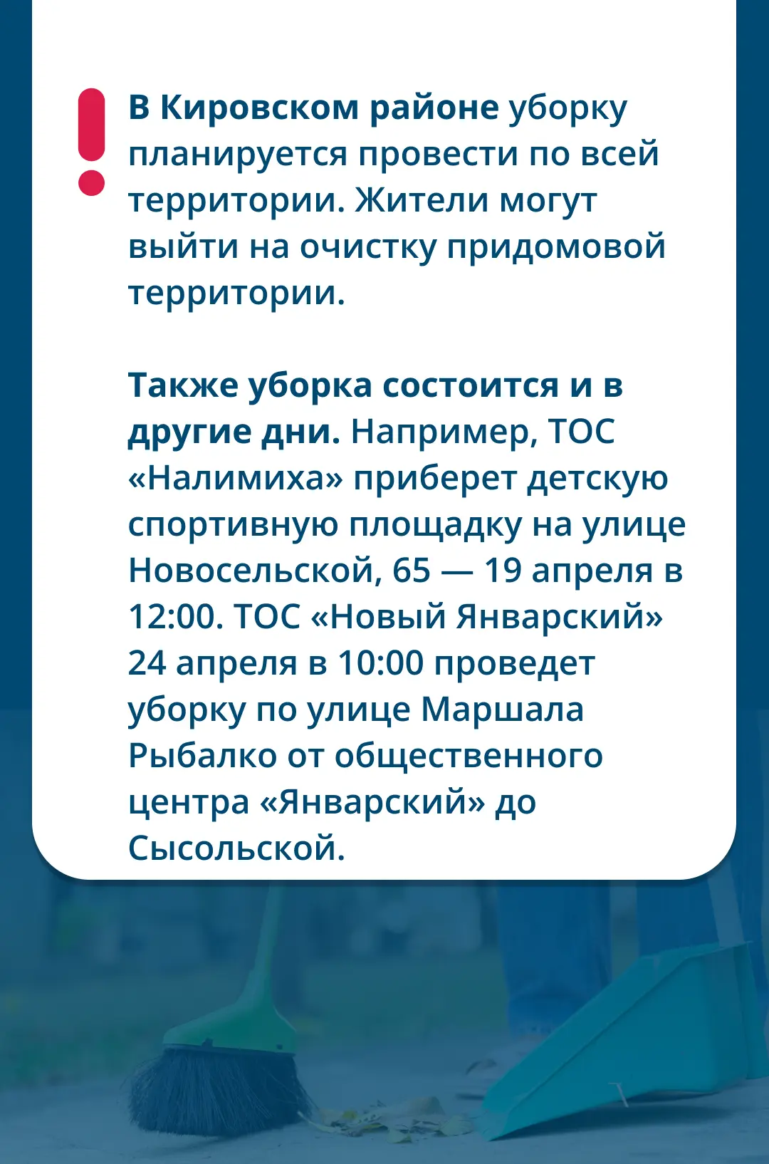 На него выйдут районные администрации, предприятия, ТОСы и активисты. Если вы хотите присоединиться и внести свой вклад в чистоту нашего города, подробности читайте на карточках.