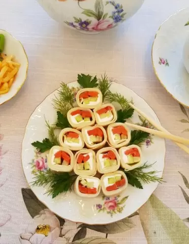 Нарежьте блинный рулет на порции и выложите на сервировочное блюдо, украсив свежей зеленью. Примечание: не забудьте дополнить угощение зеленым луком, маринованным бамбуком и имбирем для насыщенного вкуса. Теперь ваш оригинальный десерт готов к дегустации!