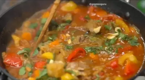 Теперь пришла очередь овощей: баклажан, морковь и болгарский перец нарезаются крупно. В казан также вливается 1 литр воды — соус должен полностью покрывать ингредиенты для равномерного тушения. После закипания огонь уменьшается и казан накрывается крышкой. Тушить примерно 50–60 минут, периодически проверяя уровень жидкости.