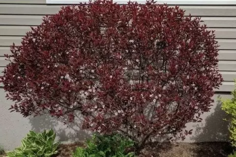 Эта низкорослая слива может достигать высоты 2–2,5 метра. Характеризуется она густой и широкой кроной, ветви которой растут в разные стороны. Сорт обладает раскидистой формой в отличие от колонновидных аналогов. Кроме того, побеги дерева покрыты блестящей тёмно-красной корой, а листья имеют насыщенный оттенок — от коричневого до пурпурного. Цветы этого сорта изначально светло-розовые, а затем становятся белыми с красными точками в центре, что делает его особенно привлекательным.