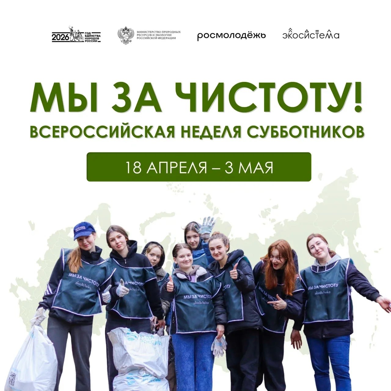 Экологическая акция пройдет с 18 апреля по 3 мая по всей стране при поддержке Росмолодёжи и движения «Экосистема» в рамках нацпроекта «Экологическое благополучие».
