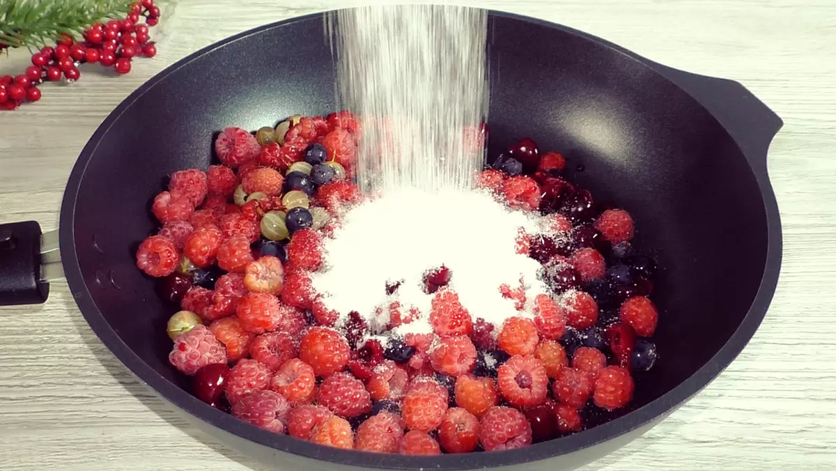 Ягоды можно выбрать любые, даже замороженные. Для начала их нужно выложить в кастрюлю и добавить половину сахара, тщательно перемешав. Затем поставить смесь на плиту.