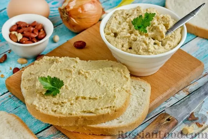 Этот паштет представляет собой великолепную альтернативу традиционным мясным намазкам. Сочетание яиц и арахиса создает необычный вкус, который завораживает. Применение лука и чеснока придаст паштету пикантность, а фасоль в сочетании с яйцом сделает его необычайно сытным. Такой паштет отлично подойдет для бутербродов или как начинка для тарталеток.