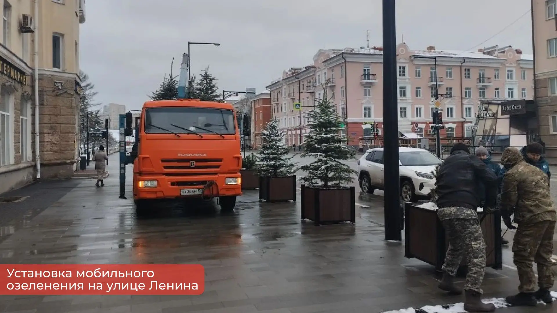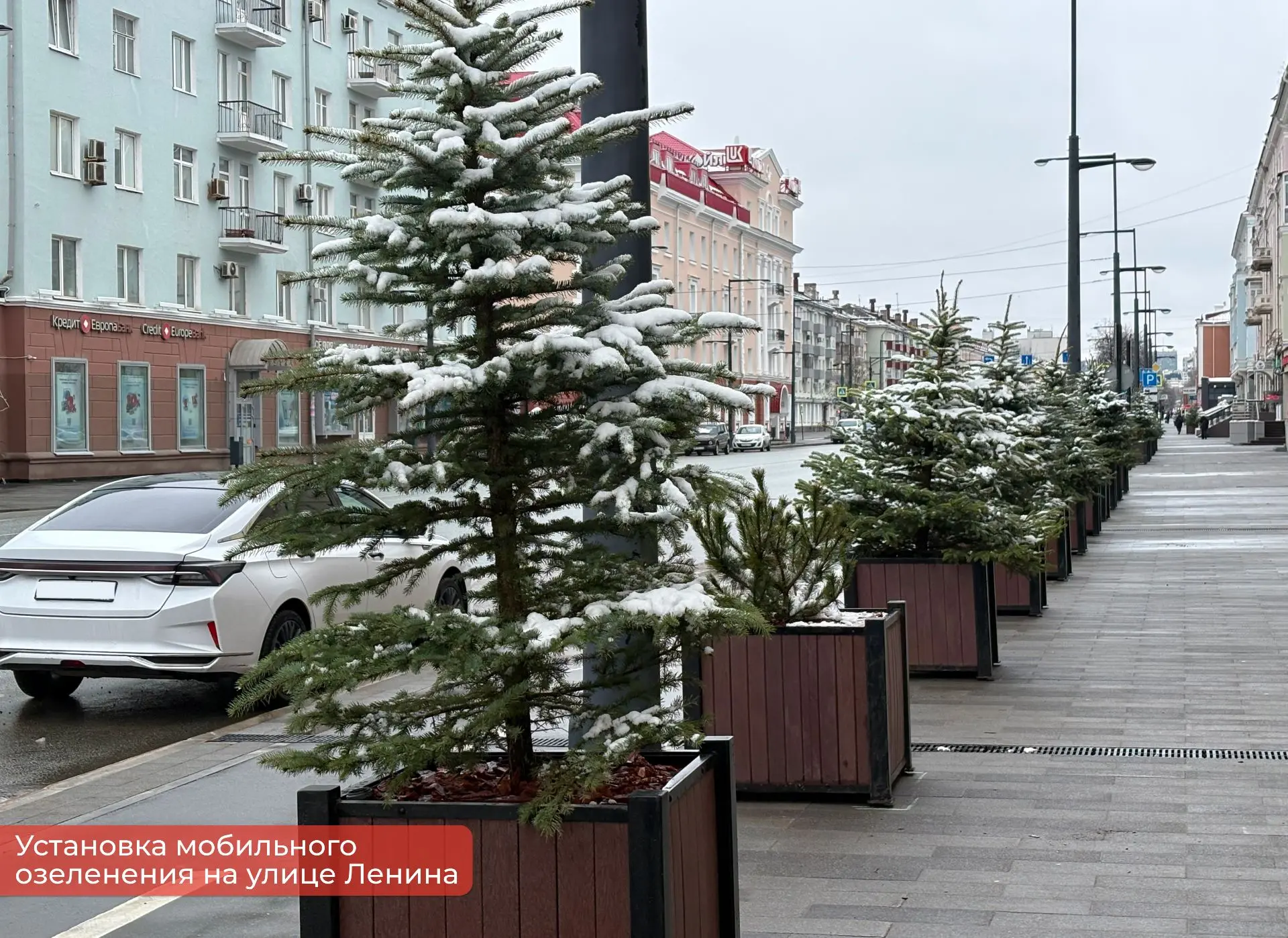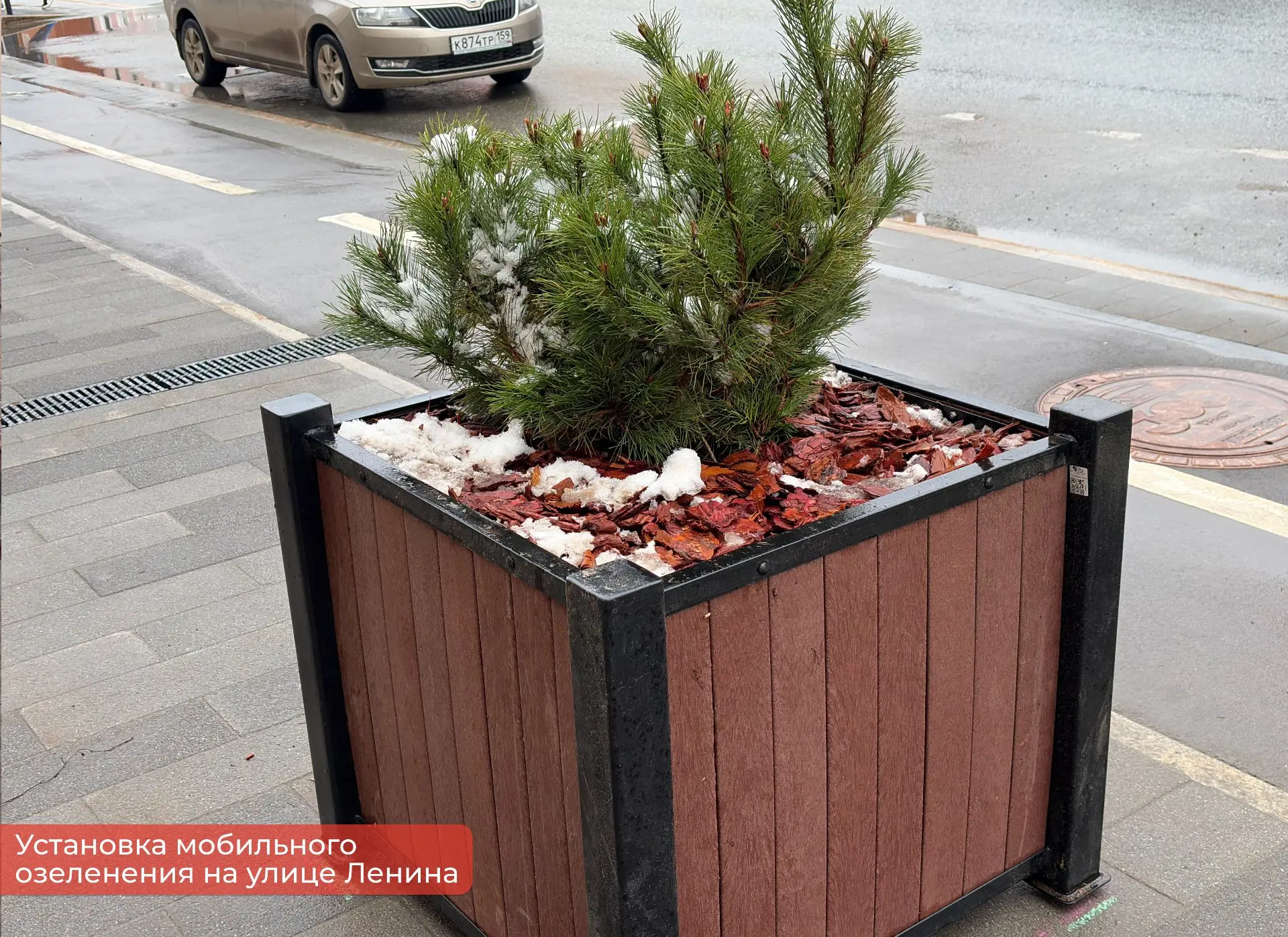 Работы идут на улице Ленина от площади Гайдара. С теневой стороны улицы поставили голубые ели, а напротив выставим горные сосны и дёрен белый.