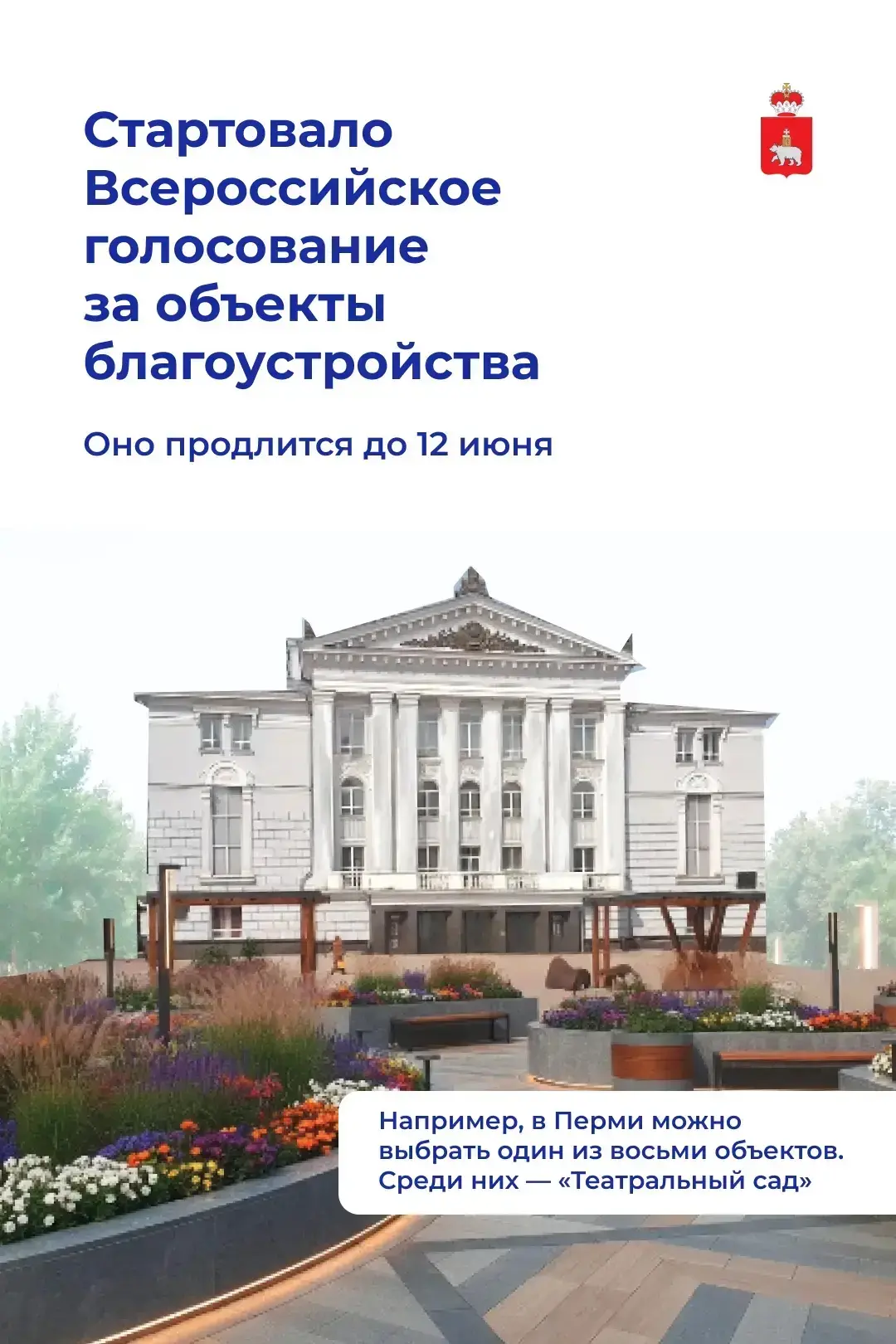 Проголосовать можно до 12 июня на платформе zagorodsreda.gosuslugi.ru, через приложение «Госуслуги. Решаем вместе» или с помощью волонтеров. Давайте вместе делать Прикамье удобнее, красивее и комфортнее для жизни.