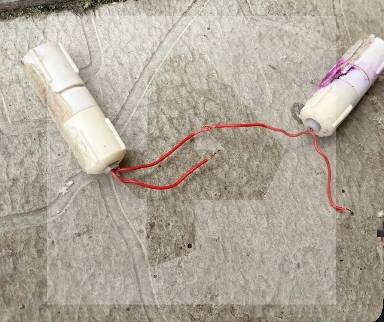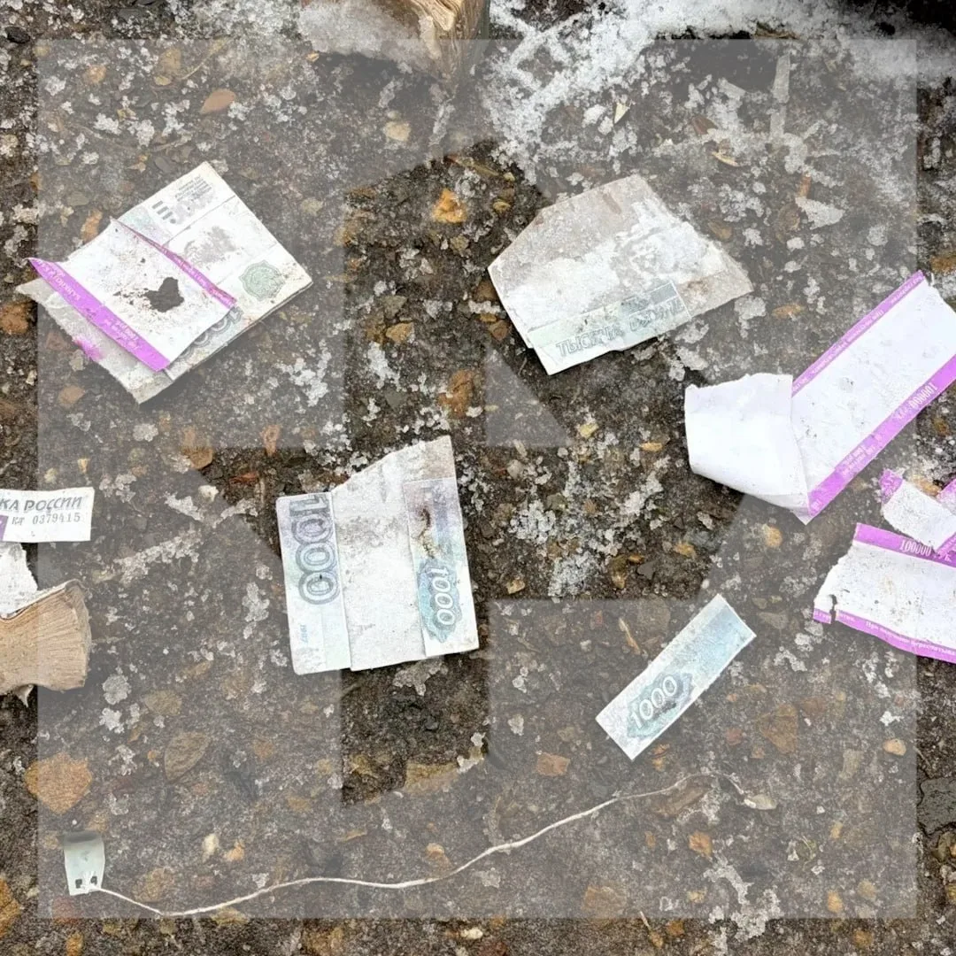 На фото — разбросанные деньги и взрывное устройство с проводами.