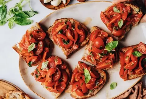 Минимальное время на приготовление: просто подрумяньте хлеб, натрите его чесноком, добавьте нарезанные помидоры с базиликом, солью и перцем. Завершите брускетту бальзамическим кремом — и вот, ваше творение готово!