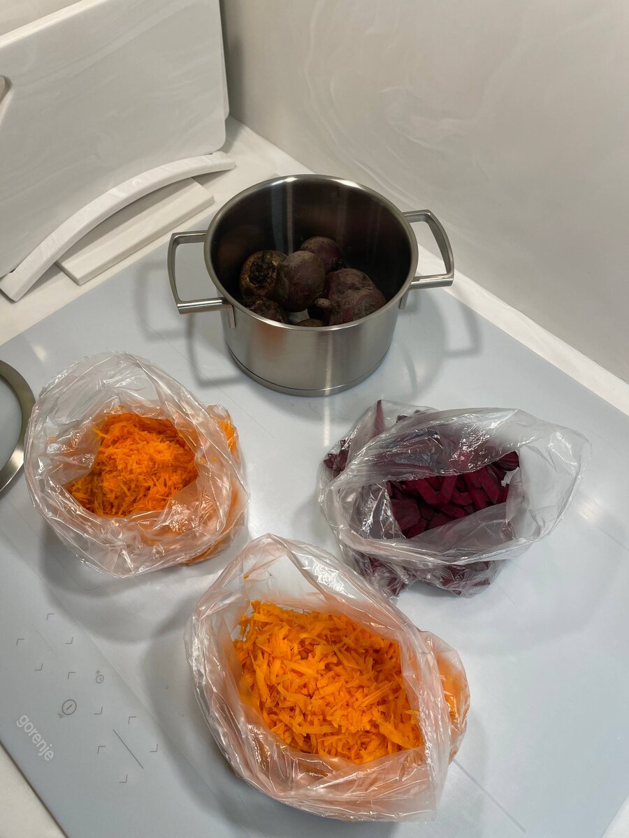 - Для свёклы: сначала отварить до готовности, охладить, очистить и нарезать; перед упаковкой удалить излишки влаги, использовать герметичные пакеты или контейнеры.