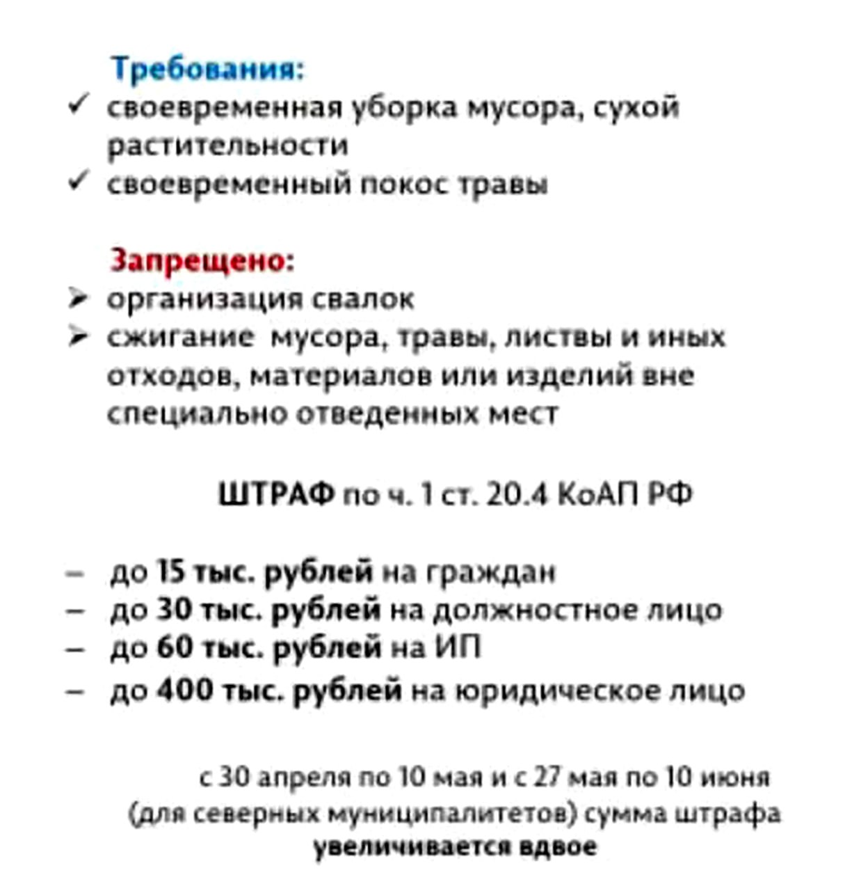 При этом за нарушение, например, когда вы сжигаете мусор и траву вне специально отведенных мест, штраф увеличится вдвое, а именно: