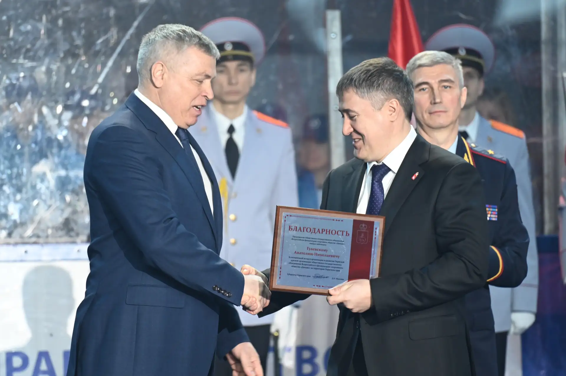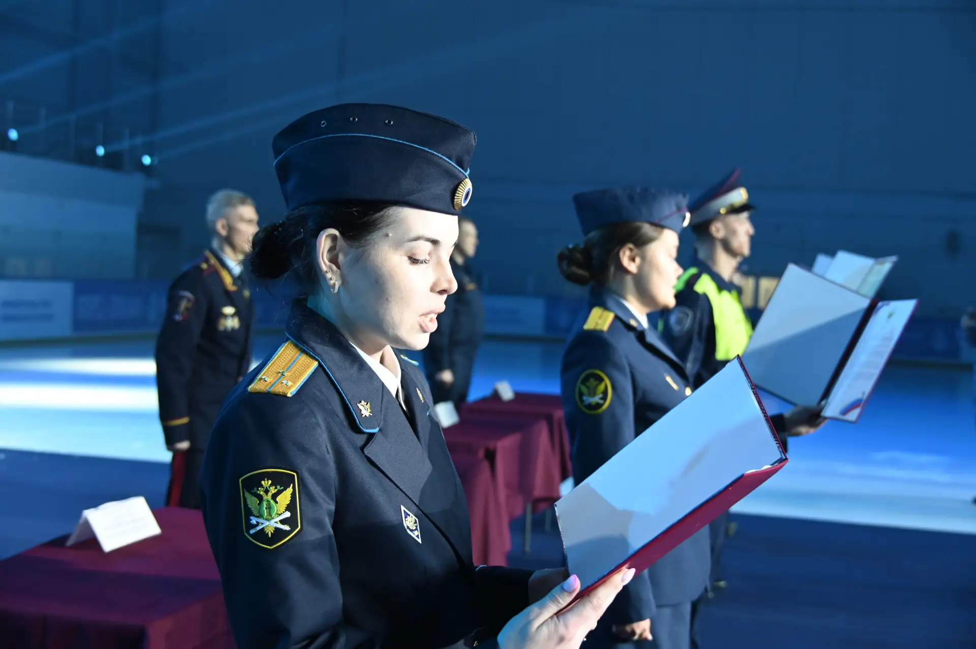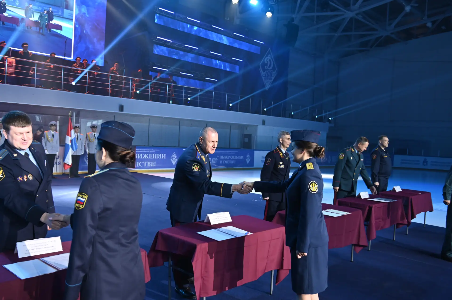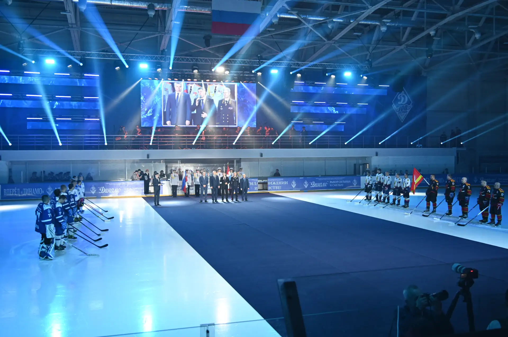 На льду спорткомплекса им. Сухарева состоялись юбилейные события. Глава региона вручил награды участникам спортивного обещства «Динамо», прошла церемония вручения паспортовгражданина РФ и удостоверений, значков и вымпелов «Динамовцам», а молодые сотрудники силовых структур приняли присягу.